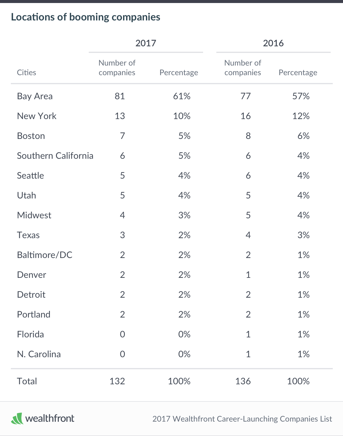 All geographies other than the Bay Area lost share this past year. While other geographies may be experiencing an increased level of startup activity, it still appears that the more successful companies are likely to be based near Silicon Valley. This means you should seriously consider moving to the Bay Area to launch your career and consider moving home to start your own company once you’ve gained the halo and experience.