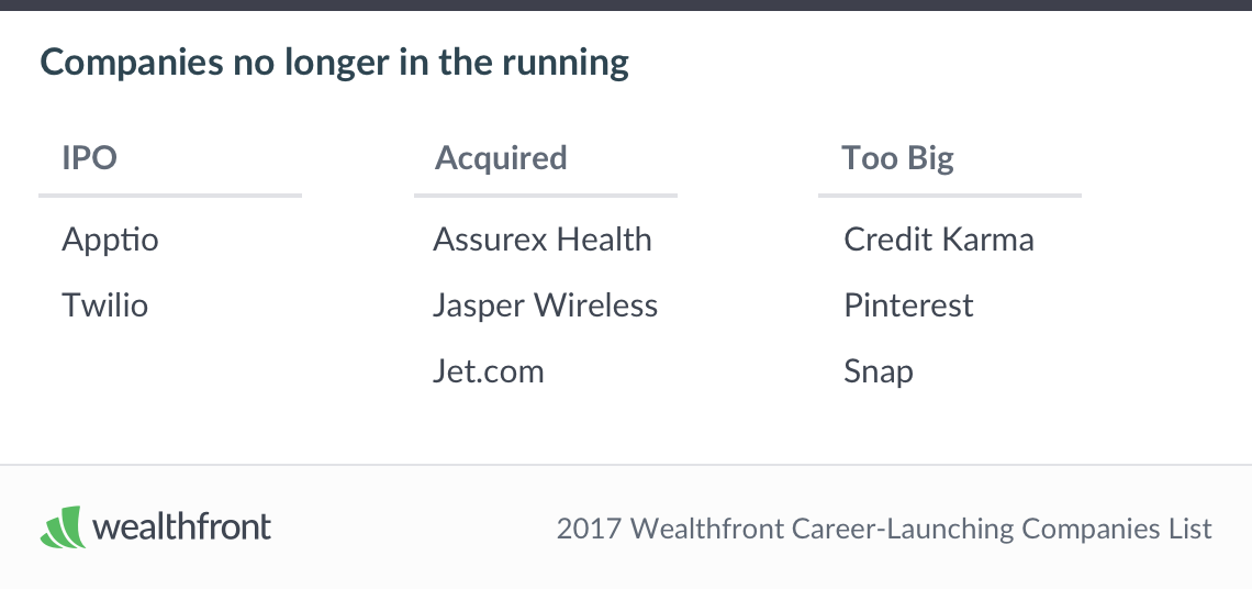 We hope you find the 2017 list helpful.While it is always possible that we may have missed a few companies, we believe this list is an excellent start for professionals looking for differentiated success in their careers. We hope that you will also consider opening a Wealthfront account if you find our advice valuable.