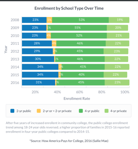 Nationwide, the share of students attending community college has jumped markedly since the recession, from 23% in 2009 to 31% in 2015. Meanwhile, the share of community college students who transfer to four-year universities has almost doubled, from less than 5% in 2006 to more than 9% in 2014.  In fact, many states actively encourage this strategy by coordinating efforts between state junior and four-year colleges to ensure students moving from a two-year school can transfer all of their course credits and avoid any setbacks.