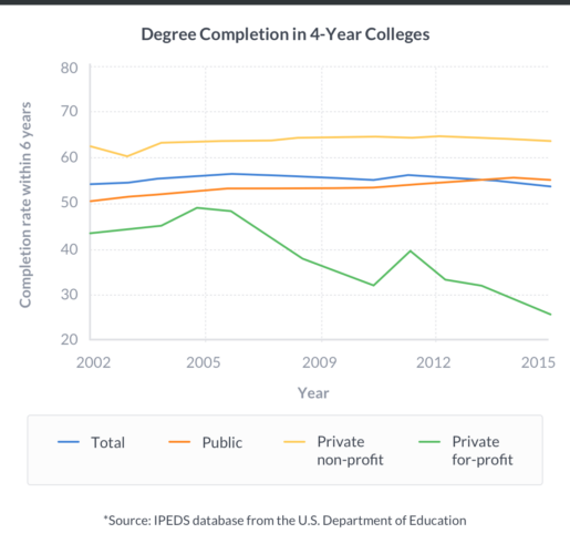 At public two-year colleges, fewer than one-quarter of students graduate on time. The record at private, for-profit colleges, like the University of Phoenix, are considerably worse. Federal data shows that the share of students at for-profit institutions who graduate within six years has plunged from more than 40% in 2002 to well below 30% in 2015.[4]