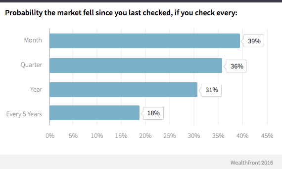 We looked at historical market data going back as far as possible (1871, to be precise) to ask what the probability is that the market is down depending on how often you check.