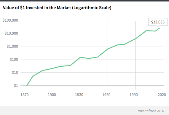 In fact, it’s a problem that tends to even itself out over time. As the chart below shows, $1 invested in 1871 is worth nearly $34,000 today. It just took some bumps along the way.
