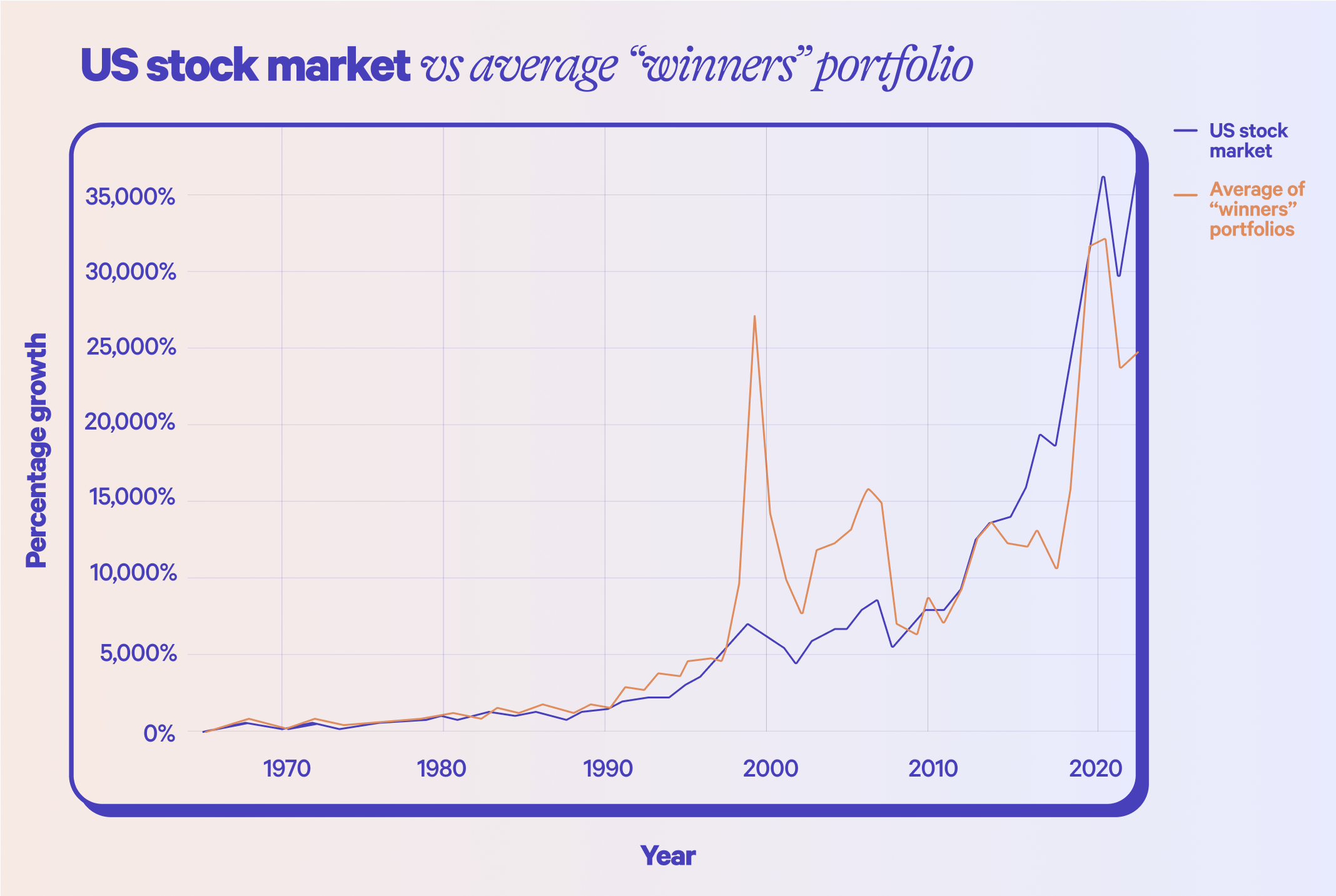 The chart below shows the cumulative return of the average of all 16 “winner” portfolios, along with the cumulative return of the US stock market. On average, the “winners” portfolios we studied performed worse, for the most part, than the total US stock market over the analysis period. This is true even though we excluded companies that would have gone bankrupt or stopped trading during the current year from the “winners” portfolios (we did this to avoid situations where we did not have a full year of data).