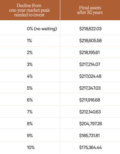 If you’re worried about investing when the market is “too hot,” you might be tempted to invest only when the market has declined a certain amount from a recent high. In this example, we’ll look at what would happen if you waited for a market decline of 1-10% from the previous year’s peak to invest your money, and compare the results to what would happen if you didn’t wait.