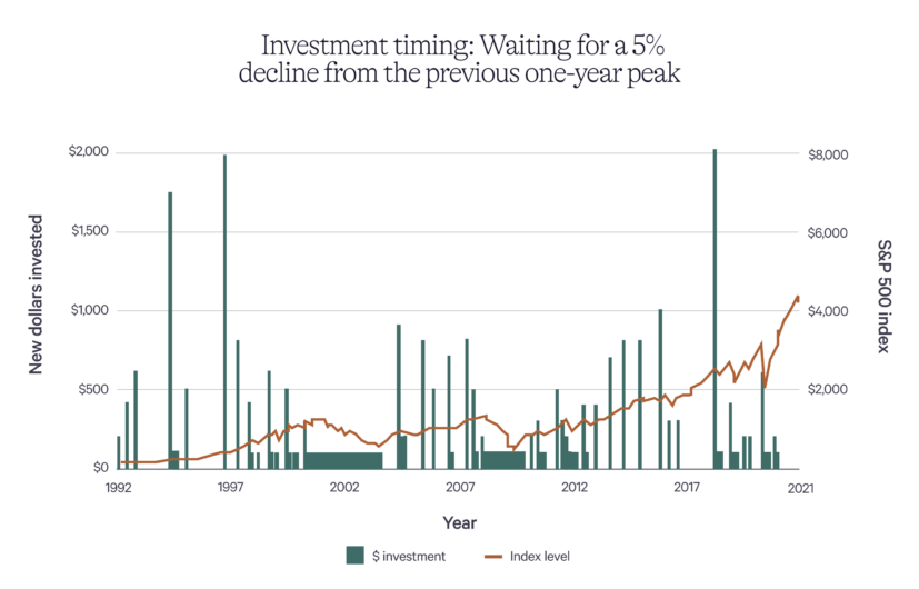 Let’s take a closer look at deposit timing associated with one of the scenarios described above. The chart below shows when you would have put money in the market if you were waiting for a 5% decline from the previous year’s peak, plotted against the S&P 500’s index level.