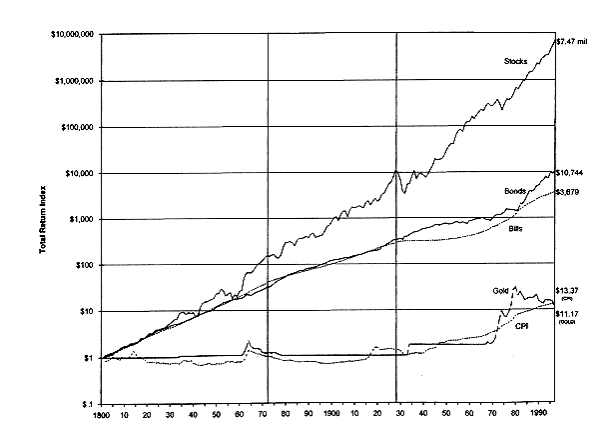 “Despite extraordinary changes in the economic, social, and political environment over the past two centuries, stocks have yielded between 6.6 and 7.2 percent per year after inflation in all major subperiods. The wiggles on the stock return line represent the bull and bear markets that equities have suffered throughout history. The long-term perspective radically changes one’s view of the risk of stocks. The short-term fluctuations in market, which loom so large to investors, have little to do with the long-term accumulation of wealth.”