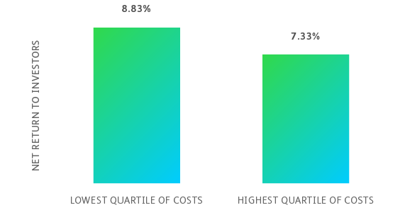 It is demonstrably false that you get what you pay for in the investment business. High-cost funds do not produce superior returns. The opposite is true. The table below shows the returns of actively-managed equity mutual funds whose costs are in the top quartile versus the least expensive funds (those in the bottom quartile of costs). The difference between the two net returns is substantial.