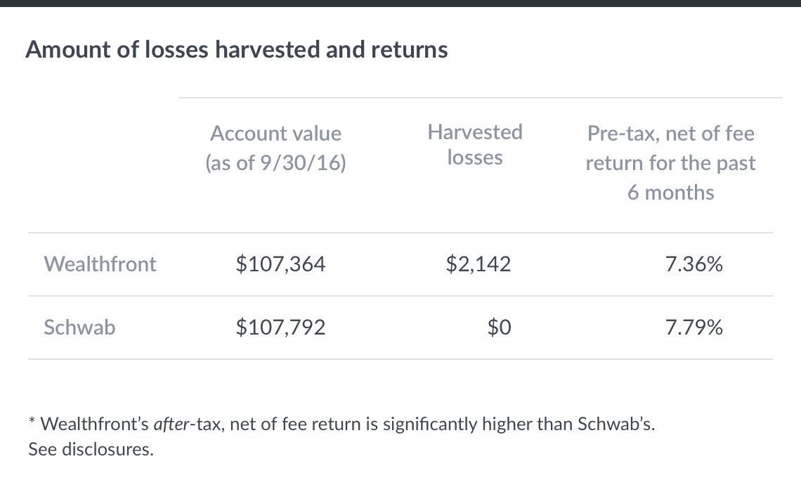 The table below presents the amount of losses harvested and the pre-tax net of fee returns in each of the accounts after six months (as of September 30, 2016):