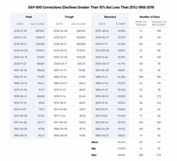 The table below displays the size of each correction and the amount of time it took the market to recover, or the time it took to return to the price achieved at the peak.