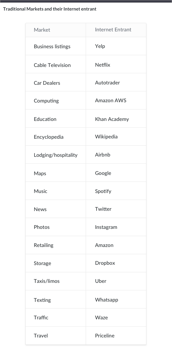 Below is a sample of the ever-growing list of traditional markets that have been destroyed by new Internet entrants: