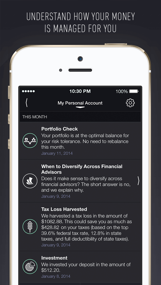 Wealthfront monitors your money daily so you don’t have to, and the mobile news feed gives you a clear idea of everything Wealthfront has done to manage your account.